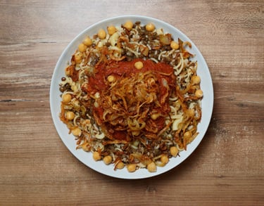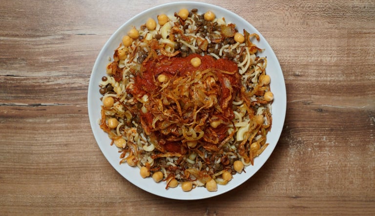 Koshari, Egypt's national dish, is enjoyed daily by over 30 million people. This delicious and nutritious meal features a hearty blend of grains, chickpeas, and zesty tomato sauce, complemented by marinated and spiced plant proteins. It's topped with crispy onion shavings and a sprinkling of doqqa nuts, bringing the vibrant flavors of Cairo's souks directly to your plate.